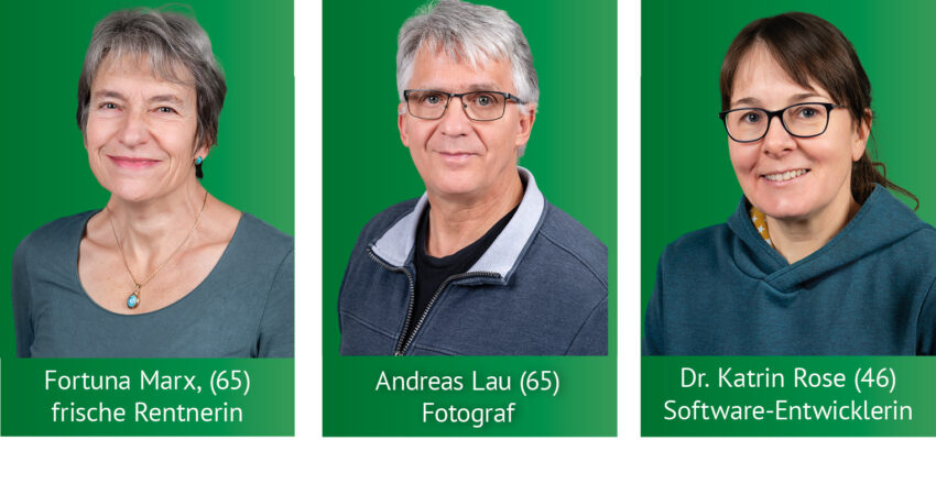 V.l.n.r: Fortuna Marx, Oecotrophologin, Pädagogin in Rente, Listenplatz 16; Andreas Lau, Fotograf, Listenplatz 21; Dr. Katrin Rose, Software-Entwicklerin, Listenplatz 19.