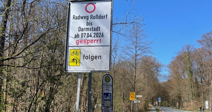 Der Ausbau des Fahrradwegs entlang der B26 und Aschaffenburgerstraße beginnt am 07. April. Entlang der Strecke werden moderne, Insektenfreundliche Straßenlaternen eingesetzt und die Breite des Fahrradweges wird mindestens 3 Meter breit sein. Eine Asphaltdecke sorgt für Komfort. Das sind gute Aussichten für alle die gerne mit dem Rad nach Darmstadt oder von Darmstadt nach Roßdorf fahren.