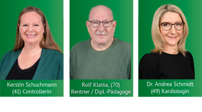 V.l.n.r: Kerstin Schuchmann, Listenplatz 5, Controllerin; Rolf Klatta, Listenplatz 10, Rentner / Diplom Pädagoge; Dr. Andrea Schmidt, Listenplatz 9, Kardiologin. In dieser Artikelserie stellen die GRÜNEN alle 15 Kandidatinnen und…