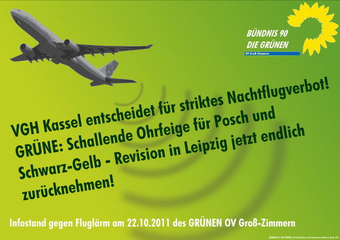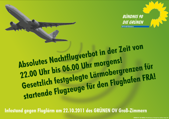 Die Grünen in Groß-Zimmern organisieren am Samstag, 22.10. von 10-14 Uhr vor der Sonnenapotheke in der Hauptstraße einen Informationsstand zum Thema Fluglärm.